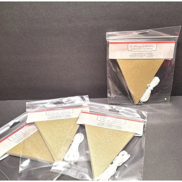 There are 12 gold glitter pendants per pack. Banner measures 6 feet long when hung.